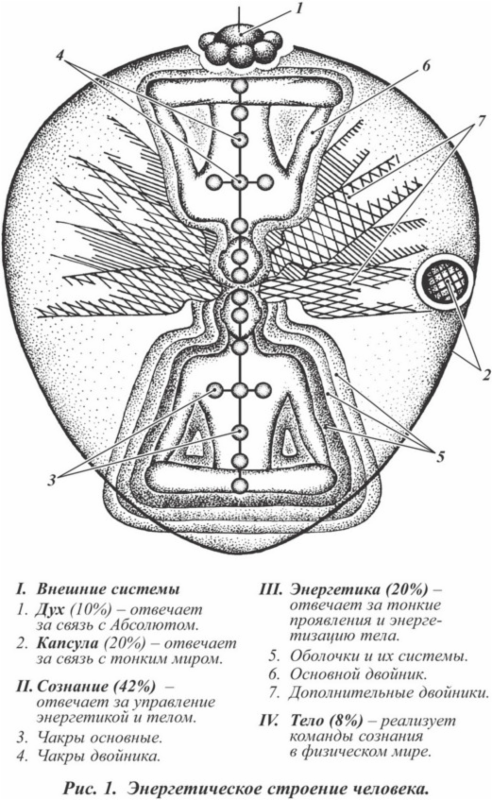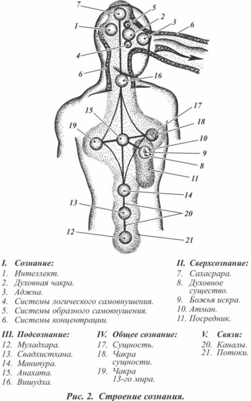 Сознание — состоит из 12 основных чакр и других систем, которые разбиваются на 4 блока: собственно сознание, подсознание, сверхсознание и общее сознание. Общее сознание — подключается при работе всех остальных блоков и состоит из чакр сущности (индивидуальные особенности) и 13-го мира (борьба, Добро и Зло).