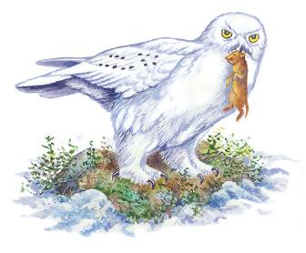 Все совы обычно днем спят, а ночью охотятся. А в тундре дни и ночи длинные – по полгода. Попробуй проспи такой день! И полярная сова приноровилась охотиться в любое время. И при ярком свете, и в кромешной тьме белая сова прекрасно видит свою жертву. А слух у нее такой острый, что она слышит даже шорох лемминга в норке, когда он ест мороженый ягель. Тут уже грызуну никуда не деться! Он и не заметит, как сова окажется рядом, летает она практически бесшумно. Протаранив снег когтистыми лапами, схватит зверька, а позже проглотит его целиком. Потом выплюнет погадку – комочек из непереварившихся шерсти и косточек. Весной в углублении на земле сова откладывает яйцо и насиживает его. Потом еще одно и еще... Поэтому совята у нее разного возраста. Первый уже крепко стоит на ногах, а последний – еще совсем слепой и беспомощный. Зато, пока родители охотятся, старший птенец согревает и защищает младших.