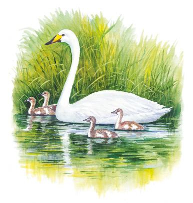 Ранней весной эти сказочные птицы прилетают на лесные и тундровые озера, еще покрытые кое-где льдом. На их берегах в зарослях камыша или тростника самка строит гнездо, напоминающее большую кучу из веток, тростника и осоки, а сам лоток выстилает пухом, который выщипывает у себя с груди и брюшка. Лебеди создают пару на всю жизнь, сохраняя верность до самой смерти. Насиживает яйца самка, но самец всегда рядом – охраняет свое семейство. Даже собрату не будет пощады, если он вторгнется в чужие владения. А через 40 дней из яиц вылупляются лебедята. Едва обсохнув, они прыгают в воду и тут же сами принимаются ловить насекомых, а родители достают пищу со дна озера, погрузив голову в воду по самые плечи. Лебеди едят корневища растений, водных насекомых. Потом подолгу перебирают свои перышки, очищая и расчесывая их. От этого пышное, ослепительно-белое оперение кажется еще пышнее. Особенно хороши лебеди, когда они грациозно, неторопливо плывут по перламутровой глади озера, словно любуясь своим отражением в воде. Но наступает осень, и вереницы белоснежных птиц, оглашая воздух прощальными криками, улетают на юг.