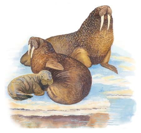 Этот морской великан – неутомимый и быстрый пловец. Загребая ластами, он мчится как торпеда. Несколько суток морж может вообще не вылезать из воды. В воде он отдыхает и даже спит. Надует горловые мешки и – как в спасательном жилете – держится около поверхности, над водой лишь усатая морда торчит. И ледяная вода его не пугает, ведь одного подкожного жира у моржа – 500 кг! Такому толстяку нужно много пищи. Еду он добывает на дне океана. Ныряя, вспахивает его мощными клыками-бивнями и собирает всплывших моллюсков, рачков, червей. В воде морж бесстрашен. Там его клыки – грозное оружие: с ними он может и белого медведя одолеть! Бивни помогают моржу и по льду передвигаться. Зацепится он ими за трещину и ползет, переваливаясь. А на лежбищах, которые моржи устраивают обычно на толстых льдинах, эти увальни похожи на огромные валуны. Но в схватке за самок они сильны и опасны, особенно для малышей, которых могут просто нечаянно раздавить. Поэтому мать, как может, оберегает единственного детеныша да и чужих моржат защищает как собственных.