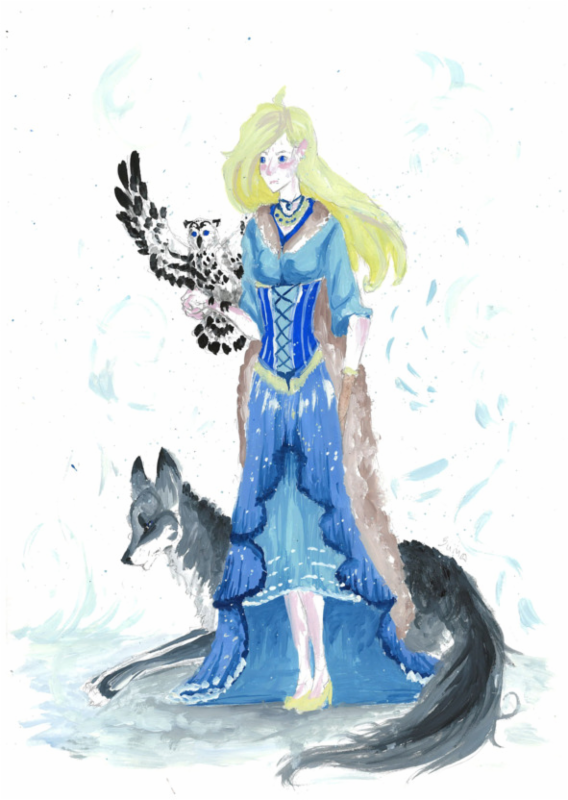 Белан был очарован красотой Зимы. На ней было белое атласное платье, которое очень хорошо гармонировало с ее бледной, морозной, с голубоватым оттенком кожей. Пепельные волосы спускались до пояса волнистыми локонами. Глаза ярко–синего цвета завораживали. Волк мирно дремал у ее ног. Но вот наконец, вернулся филин и рассказал о том, что нашел Веринью.