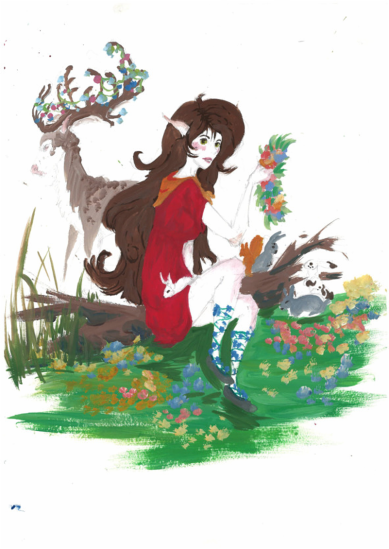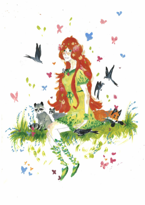 Над озером, в импровизированном кресле из упавшего дерева, сидела ослепительная девушка. На руках у нее дремал зайчик, на плечах примостились бабочки. Да и сама она была похожа на бабочку, у нее были такие же крылышки. Сверху над головой пели птицы: соловьи и жаворонки. А внизу, над поверхностью воды, качались кувшинки. Ермак подошел поближе, он узнал в девушке Лето.