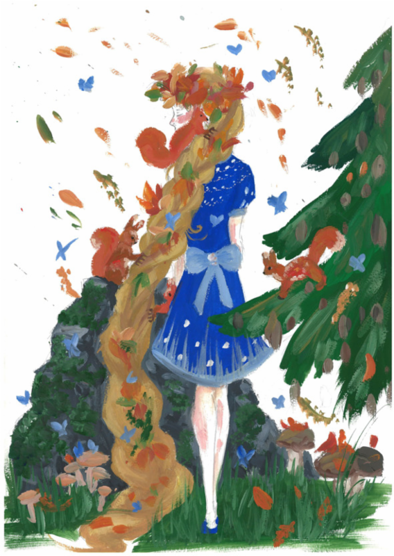 И тут он увидел за деревом девушку, которая расчесывала свои длинные волосы, стелившиеся по тропинкам, уходящим далеко в лес. Они были сплошь усыпаны красными, желтыми и оранжевыми листьями. И по волосам как по веткам, бегала белочка с маленькой расческой, помогая девушке.