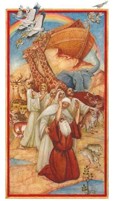 Через сорок дней дождь прекратился. Вода не убывала, но тучи уже рассеялись, выглянуло солнце, показались вершины гор. Ной отворил окно ковчега и выпустил ворона. Ворон улетал и возвращался обратно.