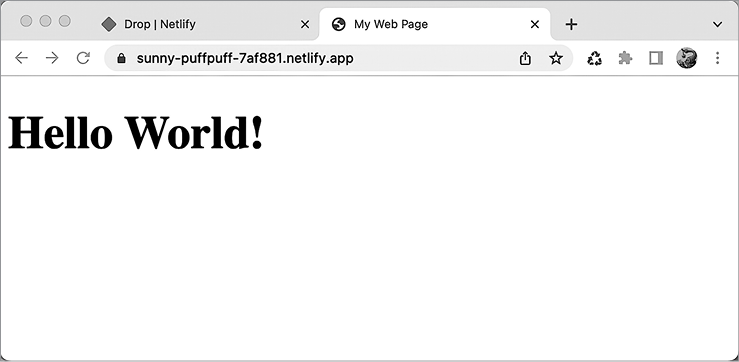 Единственный способ, с помощью которого другие люди смогут увидеть ваш сайт, — разместить его в интернете. Для относительно простых проектов, описанных в этой книге, процесс загрузки включает в себя копирование файлов, созданных с помощью ChatGPT, на сервис, предоставляющий хостинг веб-страниц. Я подробно рассматриваю весь этот процесс в Приложении B, но в основном это простая загрузка папки с файлами вашего сайта на хостинг. Рисунок 1.7 показывает пример такого процесса, в котором я перетаскиваю папку hello-world из окна справа в окно слева. После загрузки файлов веб-страницы можно сразу же просмотреть их в вашем браузере, как показано на рис. 1.8.