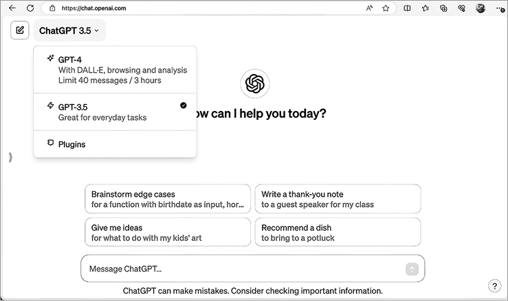 На момент публикации этой книги доступны две основные версии GPT: GPT-3.5, выпущенная в ноябре 2022 года, и GPT-4, выпущенная в марте 2023 года. Если вы используете приложение компании OpenAI2 (о котором будет рассказано далее) с бесплатной учетной записью ChatGPT (подробнее см. Приложение А) или без учетной записи, у вас есть доступ только к GPT-3.5. Если же у вас есть платная подписка ChatGPT Plus, то через приложение OpenAI доступны обе версии: GPT-3.5 и GPT-43.