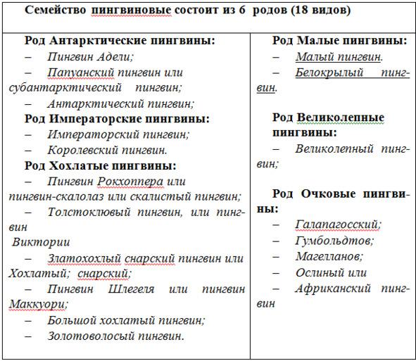 В Южном полушарии нашей планеты обитает 18 видов пингвинов: из них два вида (Императорские и Адели) в Антарктиде, а остальные — в Антарктике и в более северных широтах южного полушария (хохлатые, малые, великолепные и очковые). Гнездятся они огромными колониями иногда до нескольких тысяч особей.