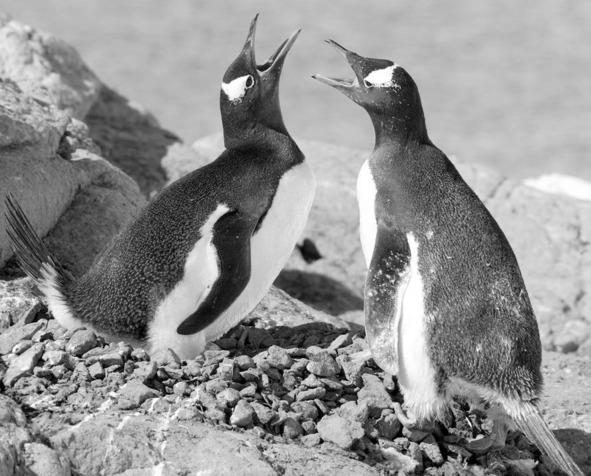Среди звуков, издаваемых пингвином, следует выделить, прежде всего, песни обольщения и удовлетворения — нечто вроде ласкового воркования, которое заканчивается протяжной нотой и поднятием головы. Трубный крик звучит на одной ноте и слышен за несколько километров. Надо помнить, что в Антарктике в ясную погоду стерильная тишина.