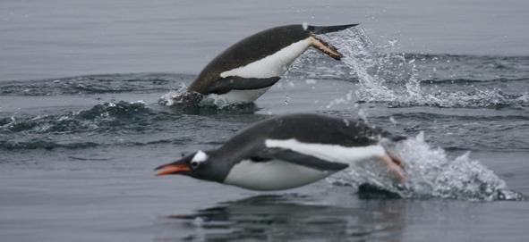 При выходе из воды и в случае опасности пингвины могут в прыжке преодолеть высоту береговой линии до 2 м.