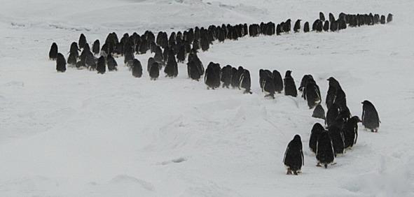 Поздней осенью Антарктические пингвины первыми покидают места своих гнездовий. За ними следуют на север в открытый океан пингвины Адели с молодежью.