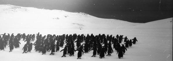 Июнь. Пингвины часто совершают зимой переходы с атлантической стороны острова Короля Георга на тихоокеанскую и обратно. Идут они небольшими группами во главе со старшим, который ведет своих сородичей известным ему путем, обходя крутые сопки и придерживаясь долин.