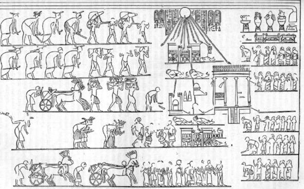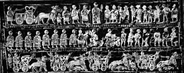 Carruagens e imagens de cavalos de Arkaim (1, reconstrução), Persépolis (2 Irã), Egito (3), Suméria (4):