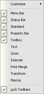 При необходимости пользователь может вызвать на экран дополнительные элементы интерфейса. Для этого достаточно щелкнуть правой кнопкой мыши на одной из перечисленных областей окна и в появившемся контекстном меню (рис. 1.2) выбрать нужную команду.