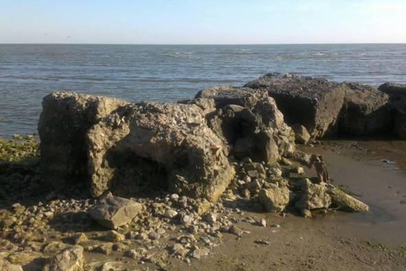 Рис.1. Берег моря с россыпью бетонных блоков — оголовок будущей буны по технологии LOW
