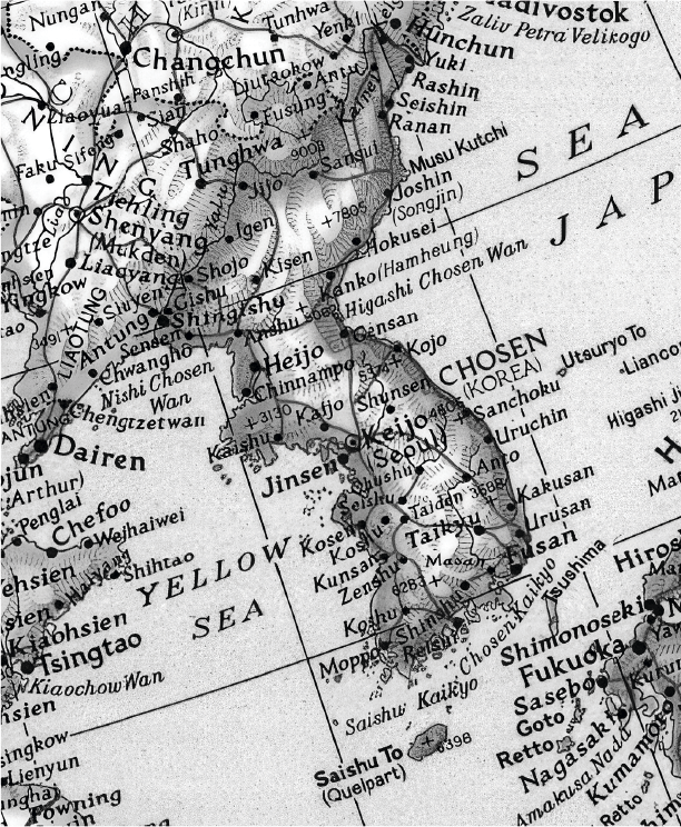 Единственной картой, имевшейся в распоряжении полковников, была Asia and Adjacent Areas Национального географического общества, выпущенная в 1942 году [36]. Как видно, на этой карте не были отмечены провинции Кореи, только города, меридианы и параллели. Полковники решили, что зоны должны выглядеть примерно равными (иначе Москва отклонила бы такое предложение). Кроме того, они стремились к тому, чтобы в американскую зону вошел административный центр Кореи — город, который тогда назывался Кэйдзё, а сейчас — Сеул [37].