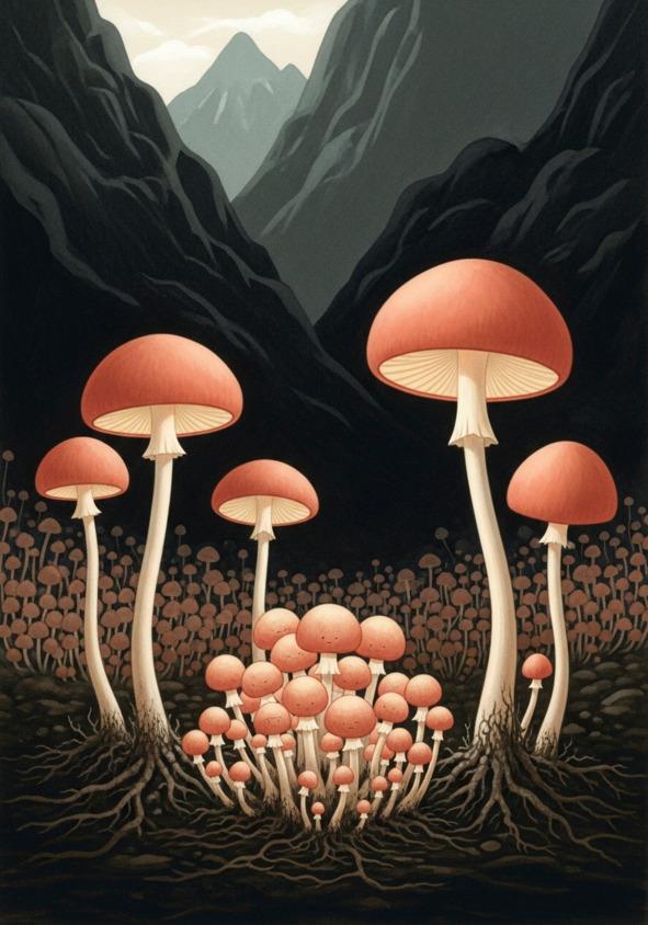 Фантастическая притча Александра Балтина «Из жизни мыслящих грибов» рассказывает о колонии разумных, неподвижных грибов у подножья гор, живущих в согласии с природой и предназначением.
