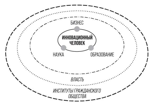 Сфера «Образование» включает в себя школы, организации СПО и вузы, которые способствуют передаче знаний и навыков в другие сферы. Сфера «Бизнес» — фирмы различных форм собственности и отраслей. Согласно модели «пентаспирали», бизнес реализует потенциал научных знаний в форме инноваций. Сфера «Власть» представляет собой различные органы государственной власти. Данная сфера формализует все процессы, происходящие в «пентаспирали» и регулирует взаимодействие между представителями разных сфер. «Власть» способствует формированию «инновационного человека», создавая «нормативные рамки», организационные структуры, обеспечивая материально-техническую базу, кадровые ресурсы, финансы и др. Значимость создаваемых инноваций оценивается «Институтами гражданского общества», которые представляют собой различные некоммерческие и общественные организации (рис. 3).