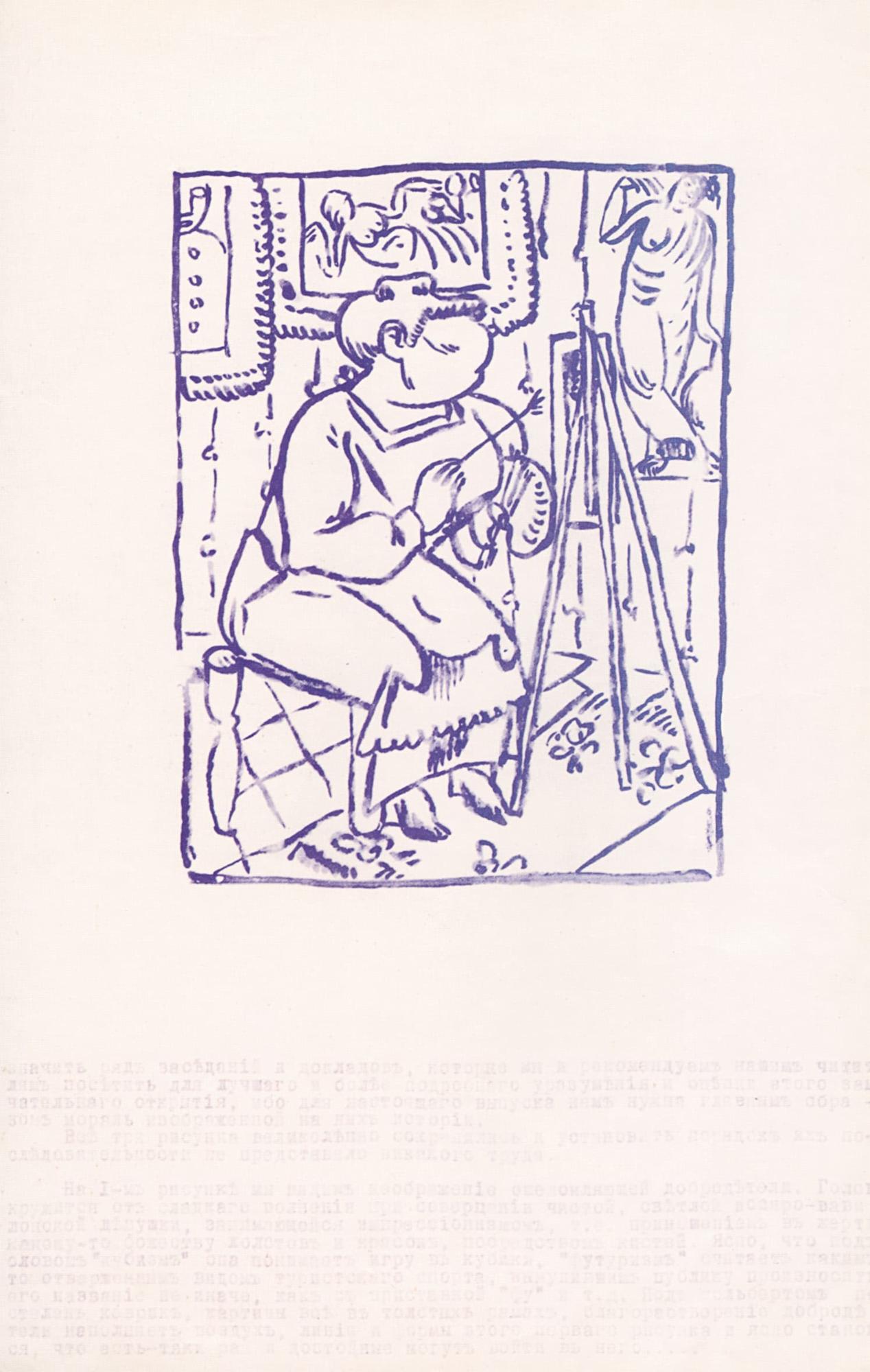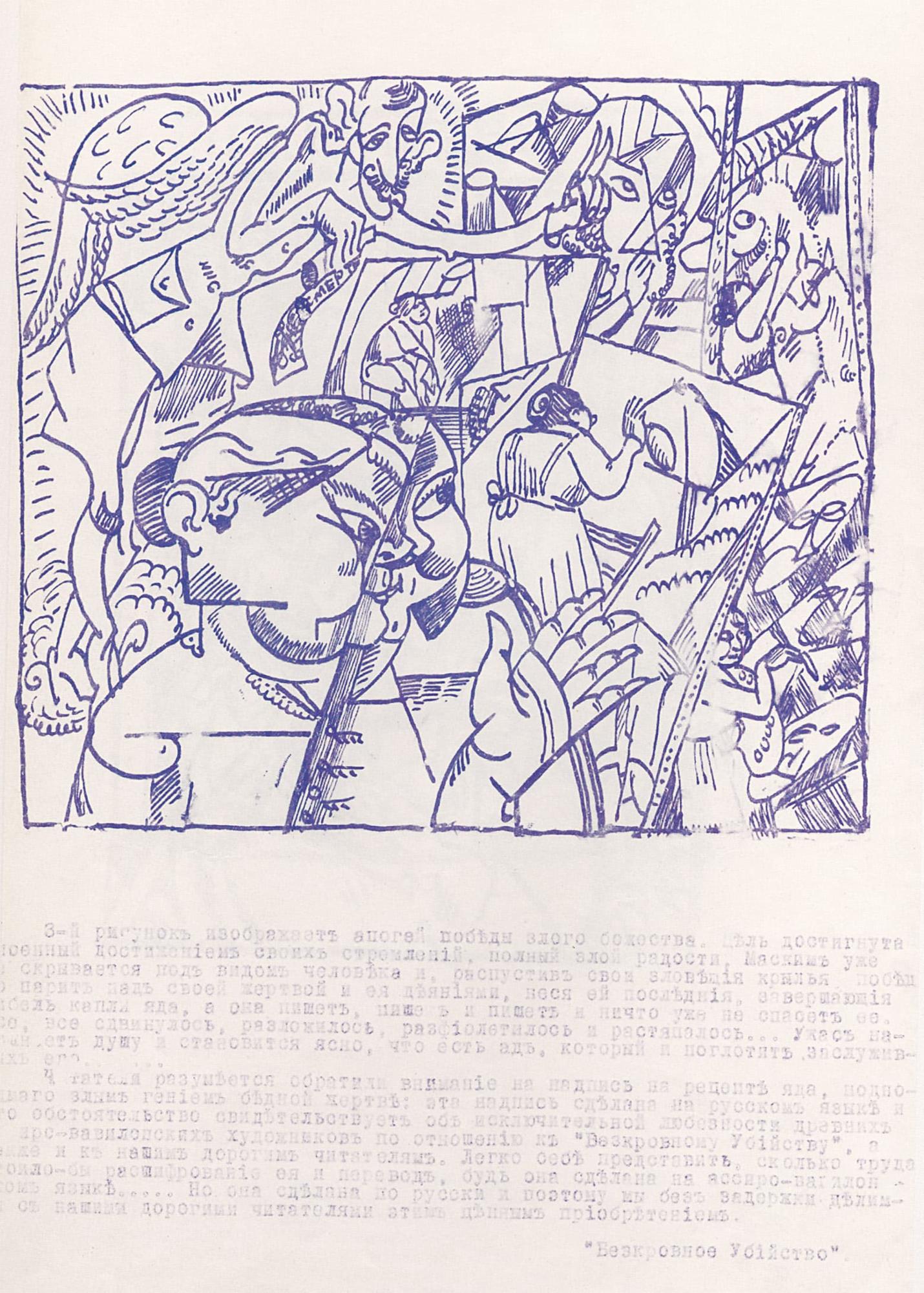 Своим внешним видом он напоминал футуристические сборники, явившиеся в середине 1910-х годов одним из полигонов для авангардных экспериментов [40]. Брошюры состояли из больших листов бумаги, иллюстрации делались с помощью гектографа, затем приклеивался текст, напечатанный на машинке. В «Бескровном убийстве» был соблюден один из основополагающих принципов футуристической книги — единство трех составляющих: писателя, художника и издателя. Автором текстов и «издателем» была Лешкова, художниками-оформителями — Ле Дантю, Ермолаева, Лапшин и Янкин.