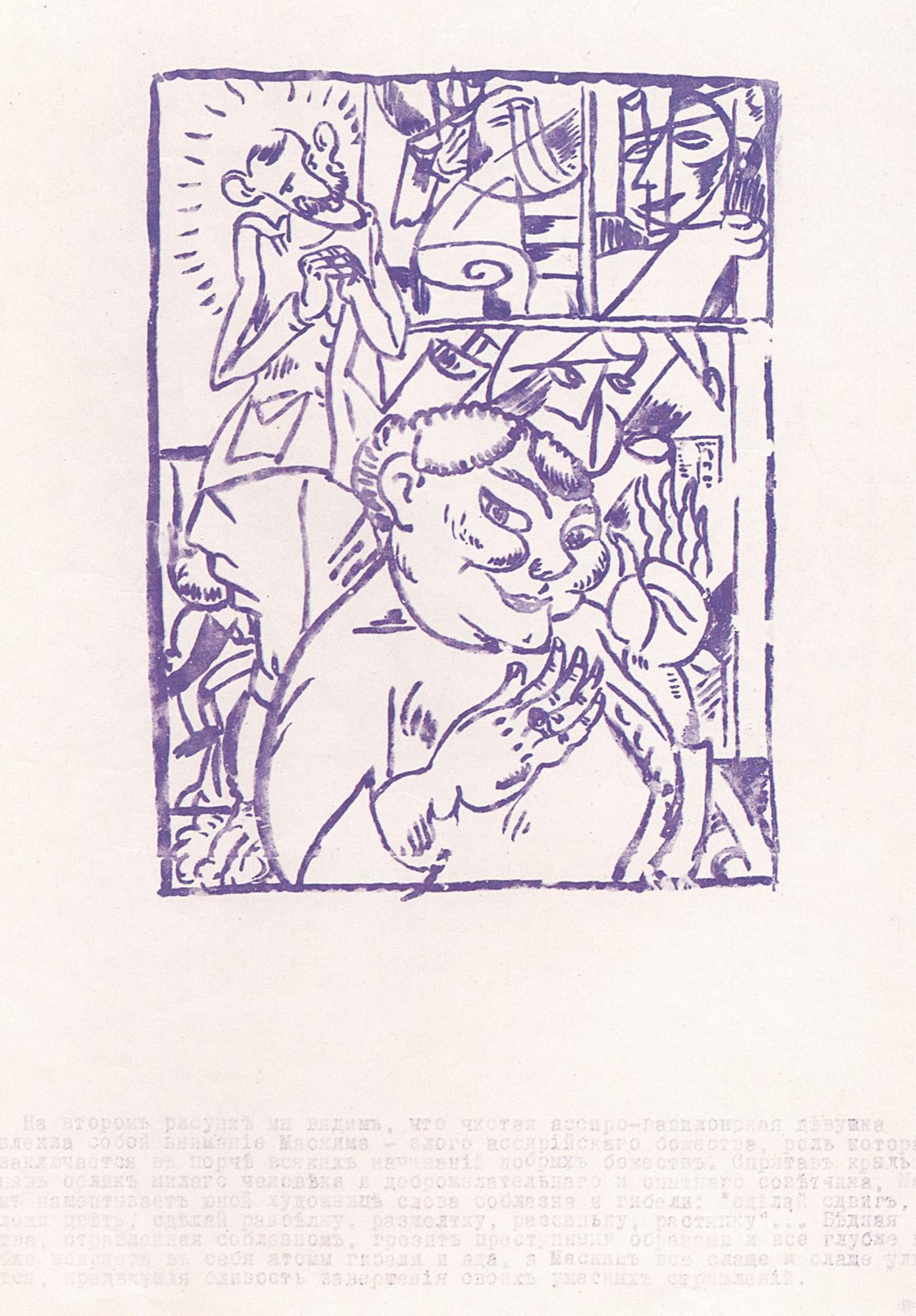 Наиболее полно «бескровноубийственное» творчество Веры Ермолаевой представлено в Ассиро-Вавилонском выпуске, появившемся в марте 1916 года. В оформлении были применены принципы футуристического построения: одновременное присутствие нескольких ракурсов, анализ формы в движении, разложение формы на плоскости, или «сдвиг». В «3-ем рисунке» ощущается влияние иллюстраций К. Малевича «Смерть человека одновременно на аэроплане и железной дороге» (1913) и «Всемирный пейзаж» (1914) для книг А. Кручёных [43].