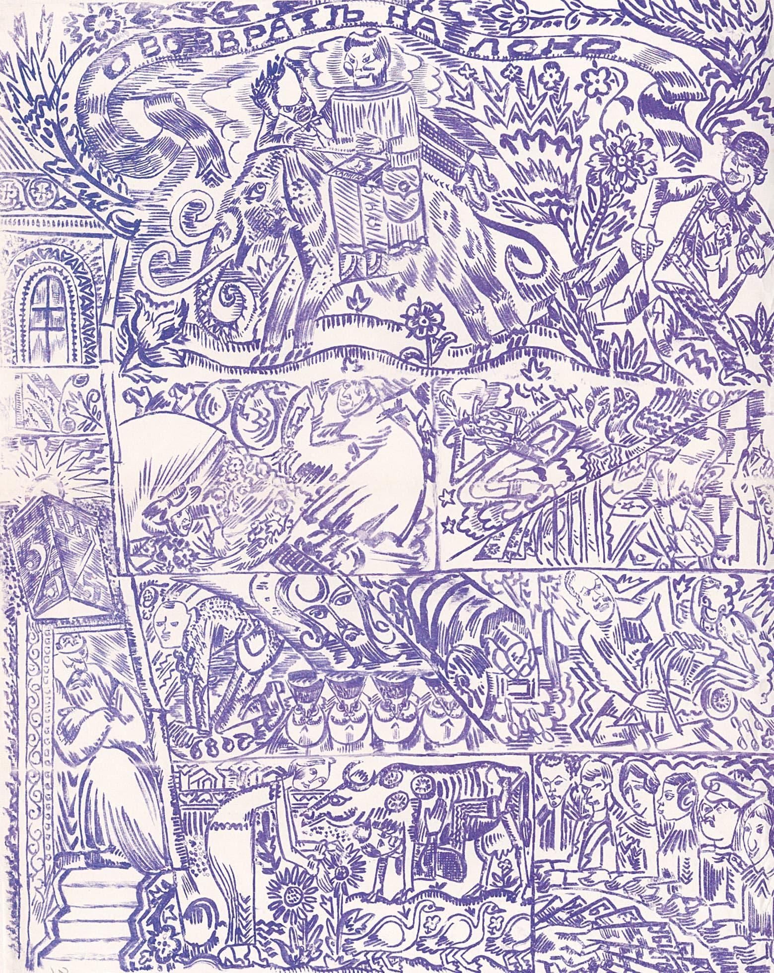 К 1917 году издание «Бескровного убийства», несмотря на множество идей [54], постепенно затихло. В марте того же года группа, руководимая Зданевичем, включилась в дискуссию против проекта «Министерства изящных искусств» [55]. С другими представителями «левого лагеря» (Н. Альтманом, К. Богуславской, Л. Бруни, В. Воиновым, А. Каревым, А. Лурье, Н. Пуниным, В. Маяковским) «бескровные убийцы» организовывали одну за другой художественные партии: «Свобода искусству», «Искусство. Революция», «На революцию». Их скандальные выступления на митингах против ограничения свободы художников со стороны государства, ведущей роли «бенуатистов» в вопросах культурной политики, за возможность утверждать принципы нового искусства, стали событием художественной жизни города. Общества брали на себя обязательства «содействовать революционным партиям и организациям в проведении путем искусства революционных идей и политических программ» [56]: рисовать плакаты, афиши, оформлять манифестации, празднества, дома и помещения года. В конце апреля «Министерство изящных искусств» «провалилось», а в августе объединения перестали существовать. Но союз «бескровных убийц» не распался. После гибели Ле Дантю [57] и отъезда Зданевича на Кавказ группу возглавила Вера Ермолаева. Ее детищем стала книгопечатная артель «Сегодня», о которой заговорили в Петрограде летом 1918 году [58].