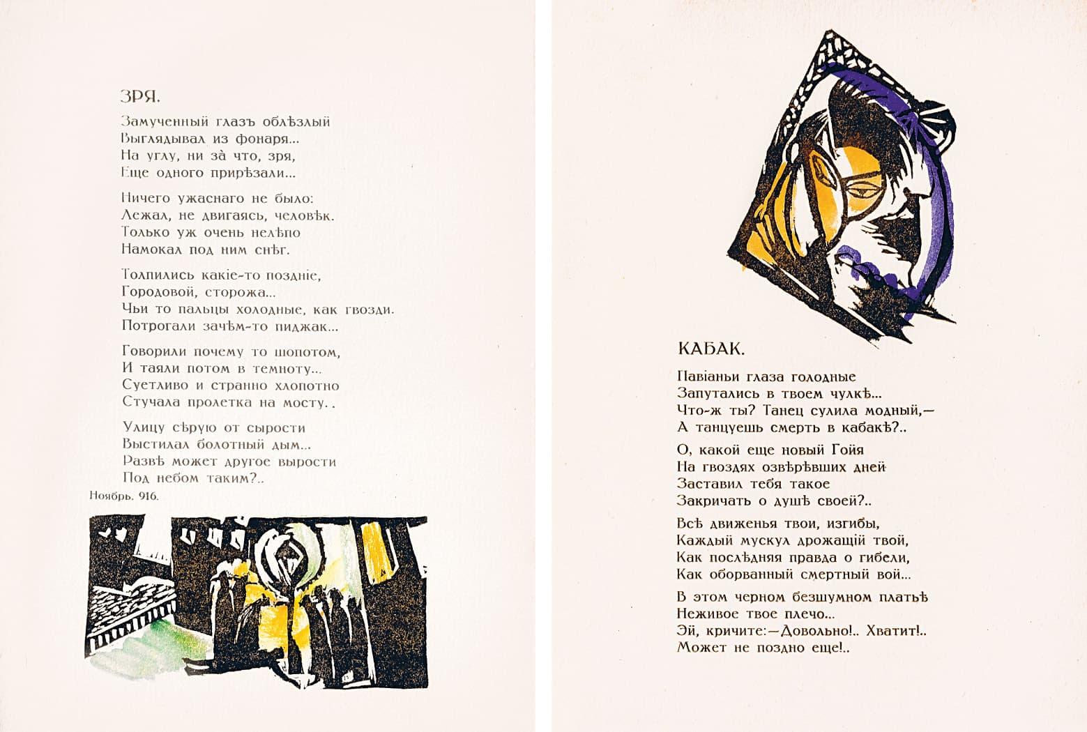 Это был союз писателей и художников. Они сами сочиняли и печатали гравюры. Раскраска делалась вручную и носила импровизационный характер. Одним из важных достоинств артельской продукции были глубокий синтез содержания и оформления, а также особый камерный характер исполнения книг. Как писал критик: «Художники артели возродили несомненно более художественный способ, широко практиковавшийся в XVI — XVII веках и вытесненный в XIX веке более дешевой цинкографией» [60]. Артель тиражировала книги современных авторов, литературу для юношества, лубки и ноты. Направленность сборников находилась в русле литературы Серебряного века. Вероятно, ее линию определял Натан Венгров, один из самых известных и активных участников содружества. На выбор авторов влияли также богемные пристрастия «бескровных убийц». Наиболее весомое место в издательском репертуаре занимали символисты — М. Кузмин, А. Ремизов, Н. Венгров, Ю. Анненков. Среди авторов были как менее известные — С. Дубнова [61], И. Соколов-Микитов [62], так и популярные поэты — американец У. Уитмен и имажинист С. Есенин.