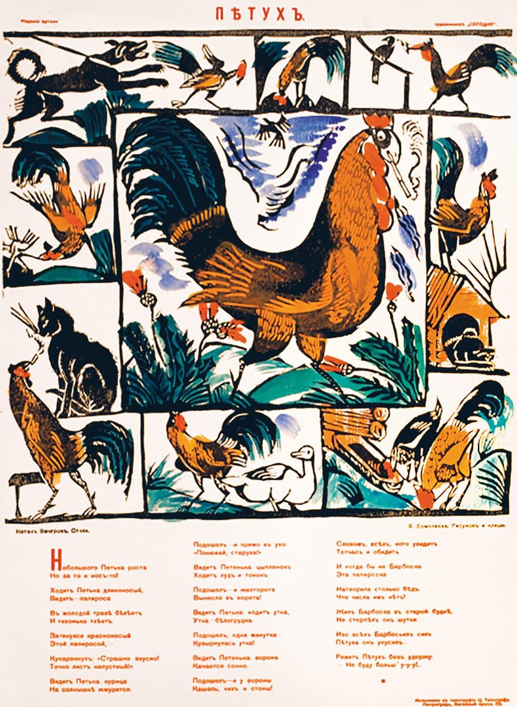 Е.Ф. Ковтун назвал лучшей книгой Ермолаевой, сделанной для издательства, «Пионеров» У. Уитмена. Яркие образы передают свободную ритмику стихов американского поэта. Фигуры, охваченные вихрем линий, нарисованы условно и обобщенно. Пионеры, первооткрыватели и новаторы, воспетые Уитменом, не могли не импонировать молодой художнице, так как имели параллели с современными ей событиями: «...Оставляем всё прошлое позади. Мы прокладываем путь в новый могучий, многогранный мир, молодо и бурно завоевываем мир труда и движения <…> всё смеем, всё дерзаем — мы идем по неведомым дорогам — Пионеры! Пионеры!» [64] Из намеченной серии детских лубков выпустили только два — «Петух» Ермолаевой и «Как пропала Баба-Яга» Лапшина. Лубки были рассчитаны на детскую аудиторию и стилизованы под народные картинки с характерной для них красочностью, условностью, плоскостностью. Здесь использовался затемненный «под старину» цвет, нарочитая грубость моделировки, условность формы. У живописцев «Союза молодежи», «Бубнового валета» или «Ослиного хвоста» примитив вызывал живой интерес и стал притягательным полем для реализации своих экспериментов, так же, как японские гравюры и архаичная скульптура Океании в конце XIX века вдохновляли французов.