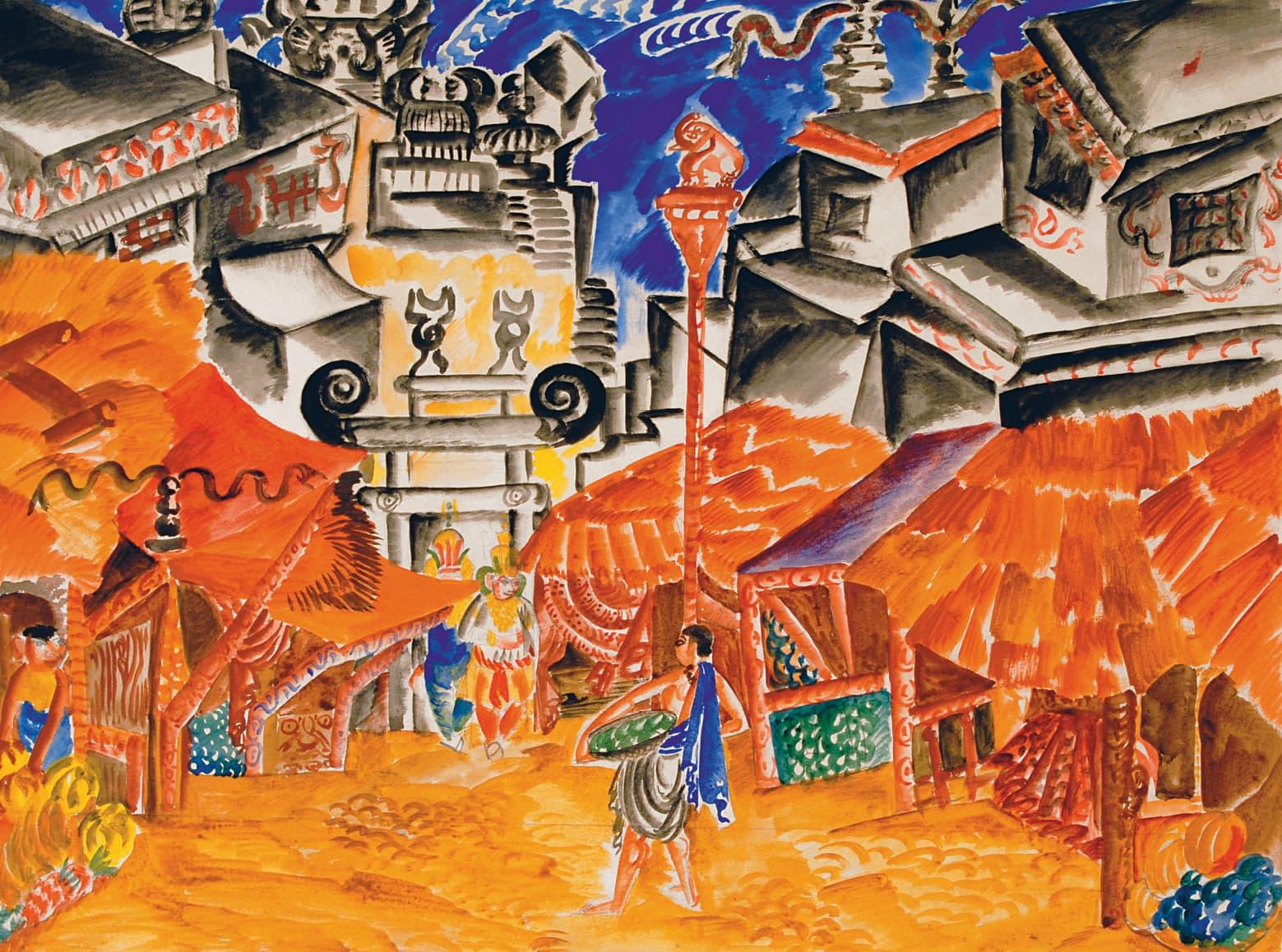 Театр являлся одной из главных сторон деятельности «Союза молодежи», и интерес к нему постоянно подогревался его председателем, Левкием Жевержеевым. По своей «народной» специфике эскизы, созданные Ермолаевой для «Огородника», упрощенно, ярко, декоративно продолжали линию «лубочной» сценографии «Хоромных действ» Союза. В отличие от ретроспективизма «Мира искусства» или театра Евреинова, «Союз молодежи» впервые обратился к балагану, фольклору, народному искусству. «Хоромные действа» <…> открывали перед декораторами путь к освоению народной традиции, к жизнеутверждающей балаганизации театра» [100]. На страницах газеты «Искусство коммуны» Иосиф Школьник призывал «развернуть и уничтожить то, что называется сценой; не сцена, а глыба, тяжесть, висящая над человеком. <…> Театр должен развернуть живописную красоту, до сих пор гаснувшую по чердакам. <…> Наши улицы и площади должны озариться самобытным искусством. <…> К ближайшему празднику мы создадим балаганы и карусели, сила цвета и форма которых докажет красоту подлинного пролетарского творчества» [101]. Постановка планировалась на сцене Эрмитажного театра, который секция получила для осуществления своих драматургических экспериментов [102]. Были приглашены известные режиссеры В. Мейерхольд, В. Соловьёв, С. Радлов, а к оформлению сцены на конкурсной основе «привлекались художники всех направлений — М. Шагал, А. Головин, И. Школьник, М. Добужинский, Ю. Анненков [103]. Однако вследствие финансовых затруднений пьеса Ляндау так и не увидела сцены, а сама Вера Михайловна Ермолаева в апреле 1919 года оказалась в Витебске. Начался новый этап ее биографии, во многом определивший вектор дальнейшего творческого движения.