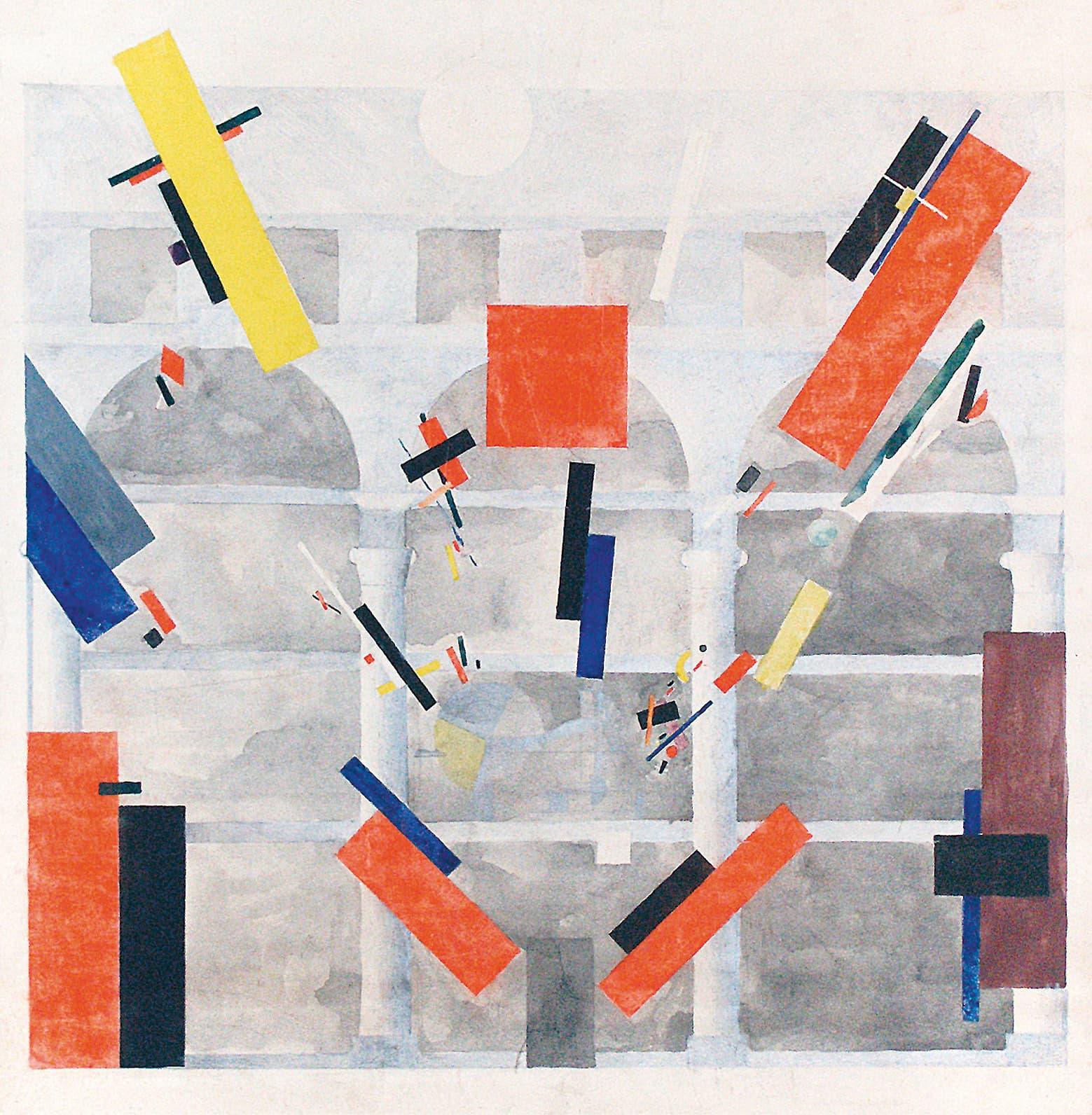 «Первые годы после революции были периодом, когда супрематизм оказал сильнейшее влияние на всё массовое искусство в целом. Красные, черные квадраты, круги, треугольники украшали стены домов, заборы, агитпоезда и пароходы, помещения клубов, знамена, обложки, плакаты, театральные декорации» [134]. Супрематисты по-настоящему преобразили захолустный Витебск: «Странный провинциальный город. Как многие города Западного края — из красного кирпича. Закоптелого и унылого. Но этот город особенно странный. Здесь главные улицы покрыты белой краской по красным кирпичам. А по белому фону разбежались зеленые круги. Оранжевые квадраты. Синие прямоугольники. Это Витебск 1920 года. По кирпичным его стенам прошлась кисть Казимира Малевича» [135]. Одним из начинаний Уновиса стало оформление города к празднованию 1 мая 1920 года. Сохранилось несколько эскизов, сделанных Ермолаевой. Это небольшого формата супрематические композиции, которые предназначались для переноса на фасады домов. В одном из эскизов (Частное собрание, Москва) Ермолаева предложила смелое дизайнерское решение: по аркадам классического ордера стремительно взмывают ввысь свободные и сцепленные супрематические элементы. «Супрематический пожар» из желтых, красных, синих фигур охватывает здание. Каждая группа в отдельности может восприниматься самостоятельной супрематической формулой. И в центре, — как точка отсчета центростремительных сил, — красный квадрат.