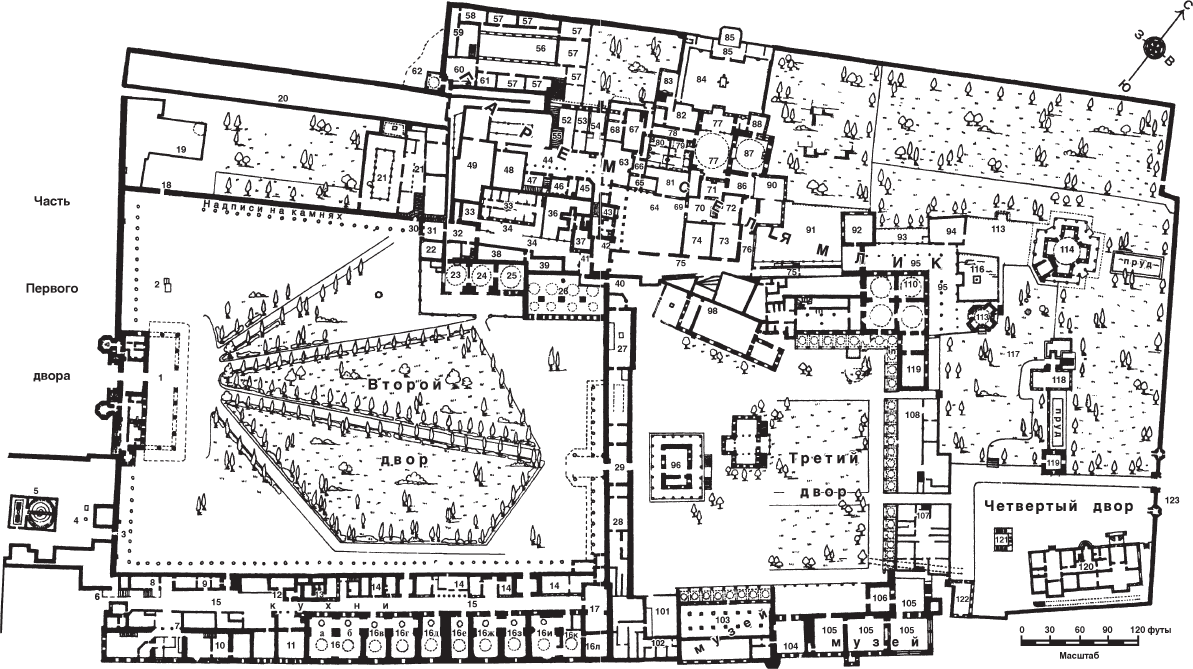 К сожалению, путеводитель был опубликован только на турецком языке, но директор сообщил мне, что вскоре он надеется выпустить его на французском или английском языках. В путеводителе имелась великолепная карта с указанием точного маршрута осмотра, в приложении – список помещений и двориков. В нем две колонки: в левой перечислены все открытые для публики помещения (всего их сорок два), а в правой те, куда доступ закрыт (их тридцать восемь). Таким образом, на первый взгляд складывается впечатление, что посетитель имеет возможность осмотреть больше половины Сераля. Однако внимательное изучение списка показывает, что это не так: дело в том, что в числе открытых несколько комнат, входящих в одни покои, отмечены как отдельные. При составлении списка помещений, куда доступ закрыт, такой прием не использовался. Кроме того, на карте дворца есть непронумерованные комнаты – за счет этого число недоступных для посещения оказывается существенно большим.