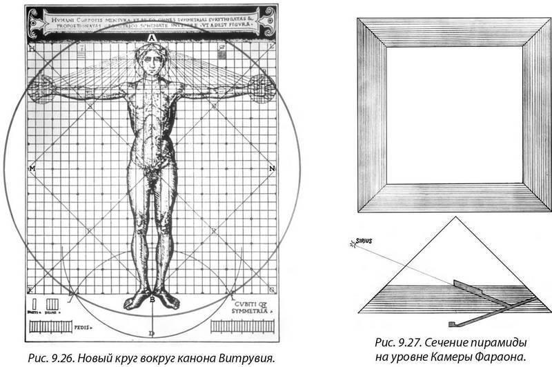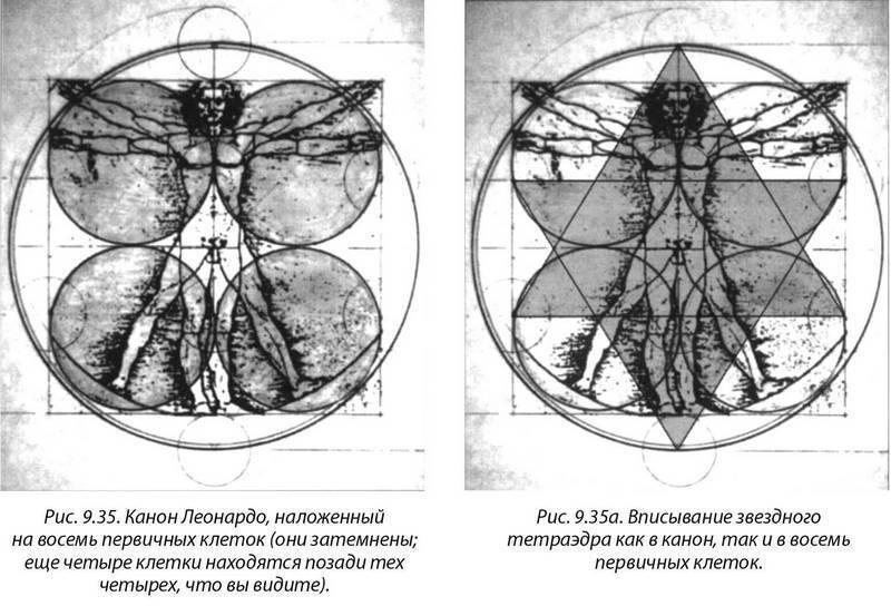 На рисунке 9.35 вы видите первичные восемь клеток (затемненные круги), окруженные внутренней поверхностью блестящей оболочки (сравните с рис. 7.26). (Четыре другие клетки находятся прямо за этими четырьмя.) Внешняя окружность образует пропорцию фи с квадратом, окружающим фигуру человека, и взрослый человек прекрасно вписывается в их геометрическое сочетание. Здесь есть даже звездный тетраэдр (рис. 9.35а).