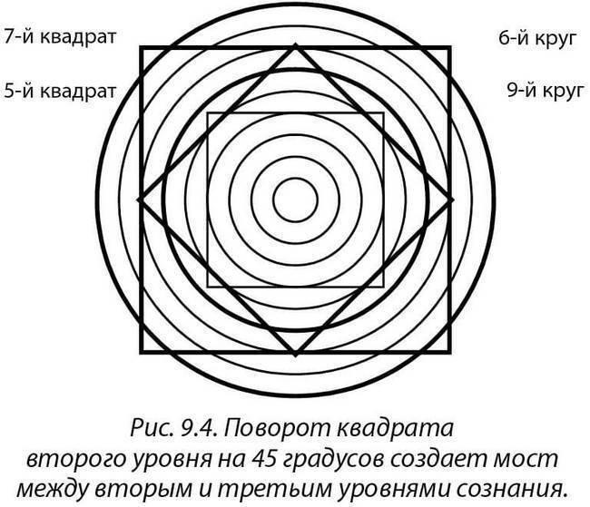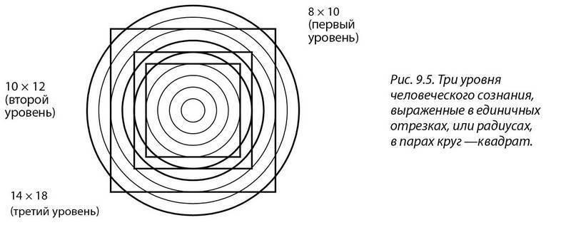 В этой системе кругов и квадратов есть два места, где можем находиться мы, обычные люди: на пятом или шестом квадрате, соотносящемся с каким-то другим кругом. На рисунке 9.1 есть только два квадрата между первым и третьим уровнями. Я не понимал, какая разница, на каком квадрате мы находимся, да и Тот не говорил мне об этом. Он сказал только: «Это пятый квадрат, соотносящийся с шестым кругом», не объяснив почему. Два или три года я пытался понять, почему это пятый квадрат в сочетании с шестым кругом, а не шестой квадрат в сочетании с седьмым кругом. Тот же ничего мне не объяснял. Он просто сказал: «Догадайся сам». Это занятие отняло у меня массу времени. Когда я наконец догадался, Тот просто кивнул мне, что означало: я прав. На рисунке 9.3 приведены три уровня сознания, а другие, негармоничные, квадраты удалены.