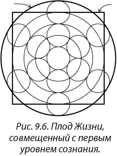 Чтобы ответить на этот вопрос, давайте попробуем наложить Плод Жизни на рисунок первого уровня сознания (см. рис. 9.6). Взгляните на него! Он точно совпадает с четвертым квадратом и пятым кругом, нашим 8 на 10! Центральный круг его тот же самый, что и центральный круг предыдущего рисунка, как и все пять концентрических кругов. На этом рисунке показан только четвертый квадрат, образующий почти совершенную пропорцию фи с пятым кругом, как мы видели ранее.