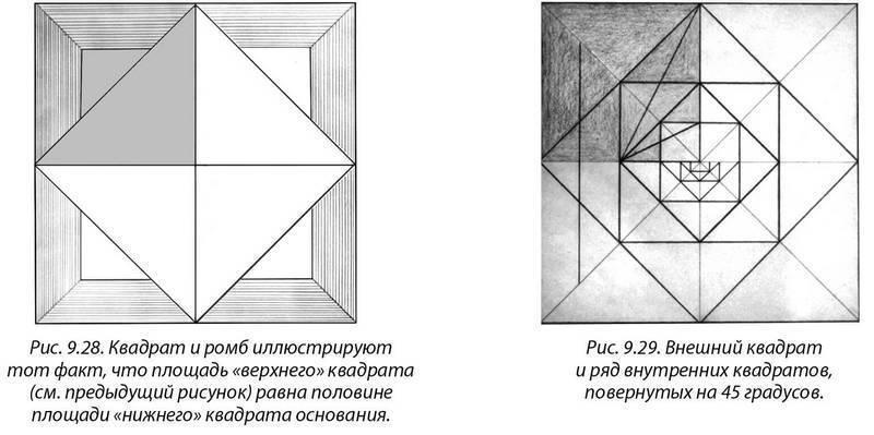 На рисунке 9.29 вы видите действительную геометрию внешнего квадрата и убывающий ряд внутренних квадратов половинного размера, повернутых на 45°. Мы могли бы вступить в долгую дискуссию об эзотерическом значении данной геометрической прогрессии, ибо сакральные квадратные корни из 2 и 5 геометрически убывают бесконечно, но я полагаю, вы поймете это сами по мере нашего продвижения вперед.
