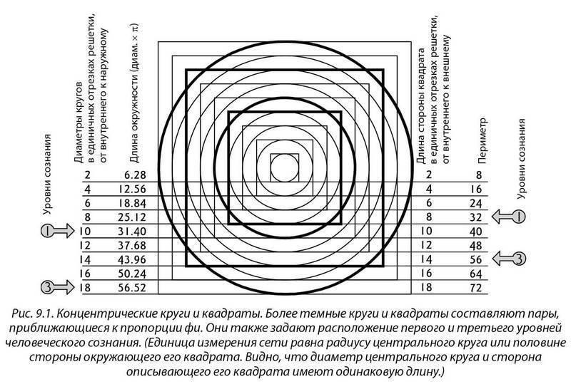 Тот велел нарисовать девять концентрических кругов и расположить вокруг каждого из них квадрат со стороной, равной диаметру круга, как на рисунке 9.1. Тем самым вы получаете уравновешенные мужскую и женскую энергии. Затем посмотрите, каким образом квадраты соотносятся с кругами, то есть как мужская энергия взаимодействует с женской. Согласно Тоту, самое главное в том, насколько периметр квадрата и длина окружности круга приближаются к пропорции фи. Это – ключ к человеческой жизни.