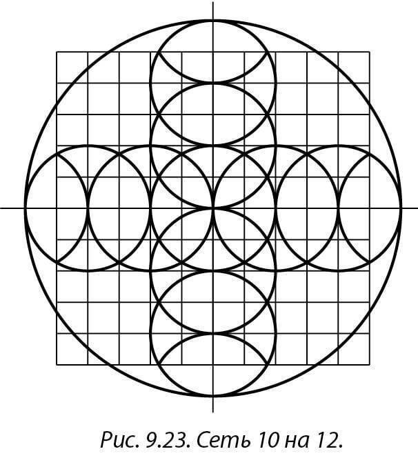 Если вы вместо четырех (как на рис. 9.22) начертите пять кругов одинакового диаметра вдоль осей (как на рис. 9.23) и проведете прямые через длины и точки касания всех Vesica Piscis, то получите сеть из 100 клеток – 10 на 12. Вы точно знаете, что это сеть 10 на 12, потому что большой квадрат составляют 10 клеток, а диаметр большого круга 12 клеток. Как мы видели на рис. 9.16, Vesica Piscis на четырех сторонах квадрата расположены наполовину внутри и наполовину снаружи него, поэтому половина ширины Vesica Piscis задает размеры клеток (вы провели линии через длины всех 12 Vesica Piscis и параллельные линии через все 10 точек их касания). Таким образом, вы получили совершенные пропорции.