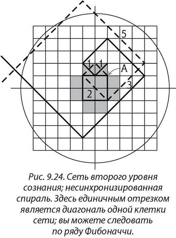 Тем не менее… когда я начал чертить спираль Фибоначчи (женского происхождения) из верхнего правого угла четырех центральных клеток (точка А на рис. 9.24), оказалось, что она не касается нужных точек, как было в сети 8 на 10, – она не имела синхронизации.