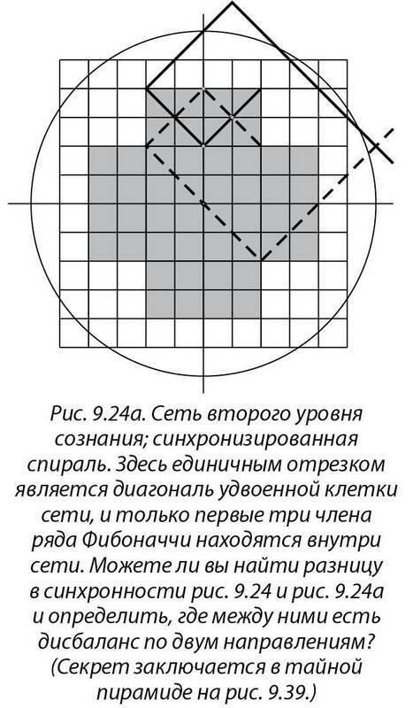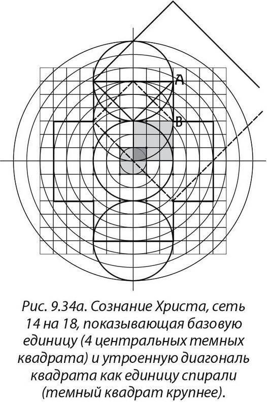 Давайте теперь рассмотрим последний геометрический рисунок сознания, 14 на 18, Сознание Христа (рис. 9.34). Все, что вам необходимо, – это девять концентрических кругов, как и раньше, квадрат, описывающий седьмой круг, и вы получите базовый рисунок сознания Христа – сеть 14 на 18. Но, говоря о четырех срединных квадратах, вы не можете их взять за основу как 1 в квадрате или 2 в квадрате; за базовую единицу вы должны взять 3 в квадрате. Три в квадрате равно 9, значит, вы берете девять клеток как базовую единицу, эквивалентную четырем квадратам в центре, и, как показано, обводите квадрат из этих девяти клеток (затемненный). Теперь вашей единицей измерения будут три диагонали. Мужская спираль (см. рис. 9.34а) начнется в точке А, пойдет вниз, вверх и наружу, а женская спираль (пунктирная линия) начнется в точке В, пойдет вверх, вниз, потом точно через центр, или нулевую точку, и выйдет за пределы сети. На этом рисунке опять появляется синхронизация, но только в том случае, если вы знаете о применении трех диагоналей или девяти клеток (темных), которые уже были на рисунке Витрувия второго уровня сознания.