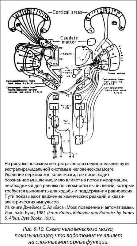 Рисунок 9.10 – это схематическое изображение человеческого мозга из книги Джеймса С. Альбаса «Мозг, поведение и автоматизмы» (Brains, Behavior and Robotics by James S. Albus). В книге показано, что можно произвести лоботомию, удалив верхнюю половину черепа со всем его содержимым, и человек не умрет, что само по себе кажется мне удивительным. Это веское доказательство того, что египтяне говорили правду: верхняя часть нашего мозга была добавлена и не является абсолютно необходимым компонентом для жизни, она как бы отдельна от того, чем мы были.