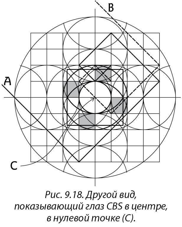 Есть и другой аспект сети 8 на 10, но пока я коснусь его лишь слегка. Может быть, кто-то из вас знает, что всю свою философию египтяне свели к корню квадратному из 2, корню квадратному из 3, корню квадратному из 5 и треугольнику 3–4–5. Феноменально, но все эти составляющие есть в рисунке первого уровня сознания. Если длину стороны квадратиков на рисунке 9.17а принять за 1, то диагональ А равна корню квадратному из 2; диагональ В равна корню квадратному из 5; а линия С – корню квадратному из 3, из равностороннего треугольника Vesica Piscis.