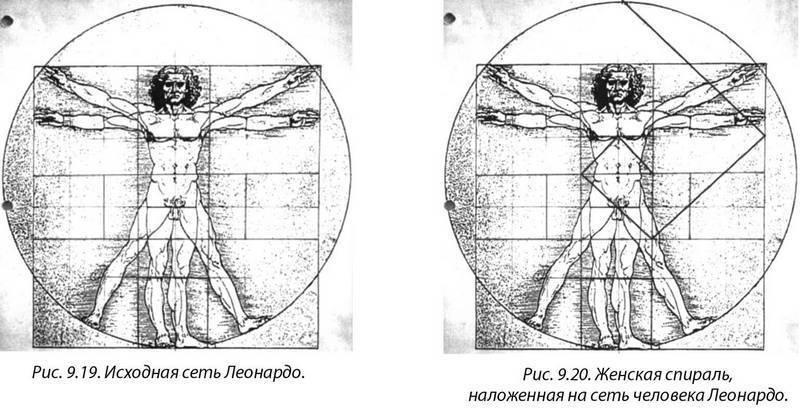 Но поскольку в своем каноне Леонардо действительно создал сеть 8 на 10 и поскольку возможно огромное разнообразие сетей, есть все основания предполагать, что он действительно понимал эти уровни сознания, основанные на геометрии. Я стал изучать все работы Леонардо, желая узнать, были ли у него рисунки канона человека с сетью 10 на 12 и 14 на 18. Я искал и искал, смотрел и смотрел, но не мог найти. Хочу подчеркнуть, что я действительно смотрел, но через некоторое время все бросил. Позже, исследуя труды Леонардо еще раз, я заметил, что рисунок канона человека, основанный на сети 8 на 10, фактически не был произведением Леонардо, так как пропорции были перерисованы с работы Витрувия. Несмотря на то что Витрувий жил примерно на 1400 лет раньше, Леонардо считал его своим главным наставником.