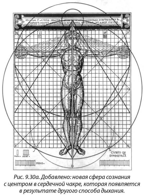 Рисунок 9.30 – это изображение второго уровня сознания с добавленными мною линиями. Для вас этот рисунок может иметь огромное значение, он для меня самого настолько важен, что стал заставкой к первым восьми главам. Рисунок показывает точные пропорции звездного тетраэдра вокруг вашего тела; проходящую посередине трубку, через которую мы будем дышать во время медитации, дающей понимание Мер-Ка-Ба – Тела Света человека; и круг в пропорции фи. На рисунке 9.30а показана сфера, о которой мы пока не говорили, – сфера сознания, которая разовьется вокруг вашей вселенской сердечной чакры, когда вы станете дышать древним способом. Я молюсь о том, чтобы к концу данной книги это знание имело для вас глубокий смысл и помогло вам в вашем духовном росте.