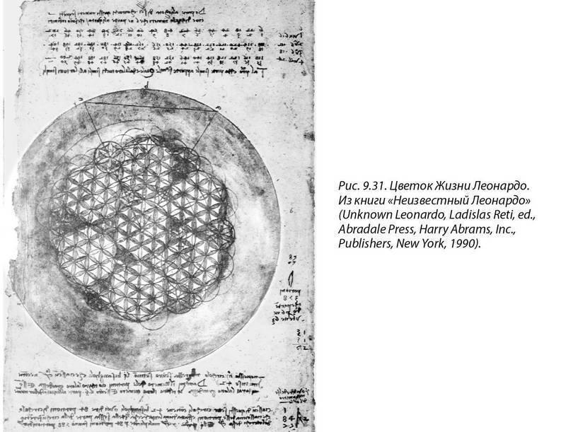 Перелистывая книгу, я вдруг увидел то, что так долго искал (рис. 9.31). Леонардо нарисовал Цветок Жизни! Это был не просто отдельный набросок. Леонардо фактически рассчитывал углы, изучал и вникал в геометрию, относящуюся к Цветку Жизни.