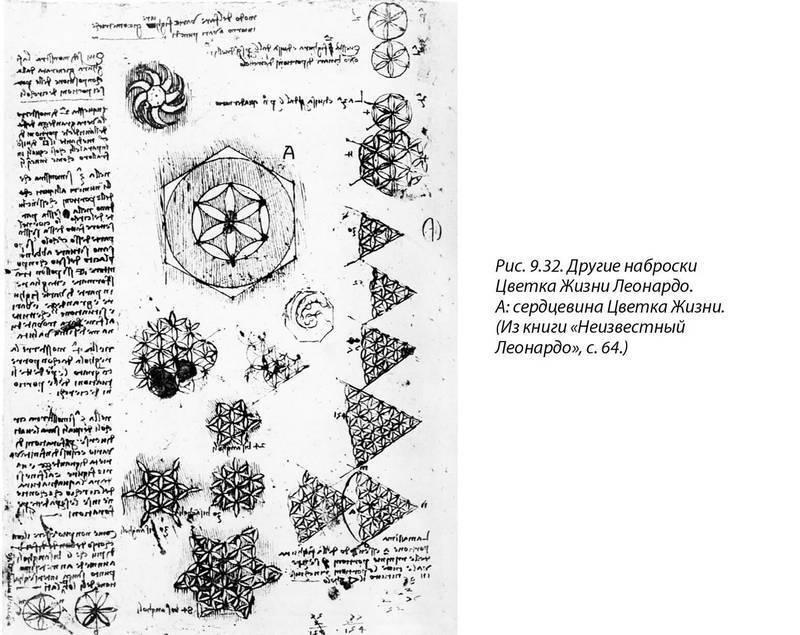 Рисунок 9.32 на другой странице книги показывает, как Леонардо рисовал различные геометрические фигуры, найденные в Цветке Жизни. Чертеж цветка в точке А – это один из ключей, которые разбросаны по всему миру, – сердцевина Цветка Жизни. Вы найдете этот образ в храмах, монастырях и подобных местах, вновь возвращающих нас к основополагающей информации о Творении, которую мы забыли.