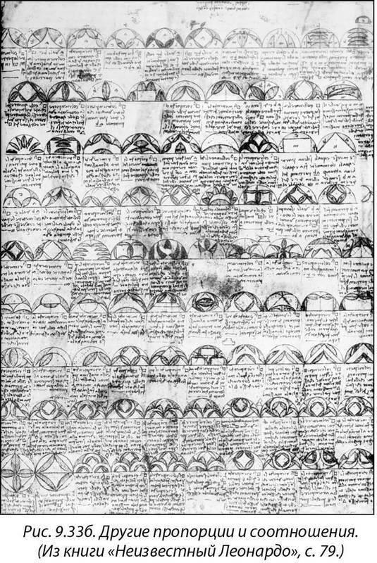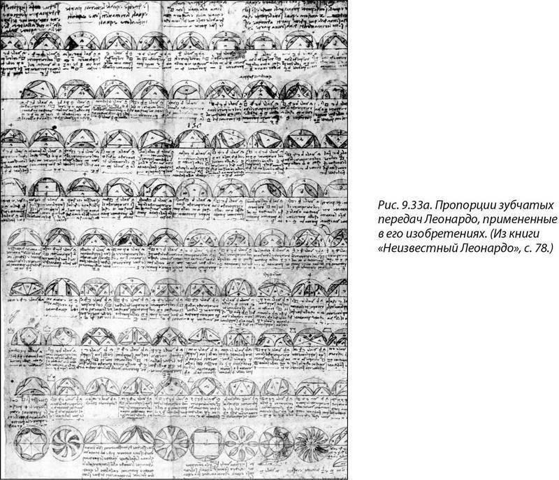Леонардо продолжал работать со всевозможными соотношениями и рассчитывал углы, которые находил. Насколько мне известно, великий мастер был первым человеком, разгадавшим все эти пропорции и воплотившим их в физические изобретения. Он придумал удивительные вещи, основанные на этих пропорциях (рис. 9.33а), – такие, как вертолет, который он сначала увидел в своем воображении, зубчатые передачи, какие мы сегодня используем в трансмиссии автомобиля. И все они вышли из его рисунков, исследующих Цветок Жизни! Издатель книги не понял, чем все это было. Он только сказал: «Вот что натолкнуло Леонардо на изобретение его зубчатой передачи». А Леонардо все продолжал и продолжал работать, выявляя как можно больше пропорций. Приведу еще одну страницу из его работы (рис. 9.33б).