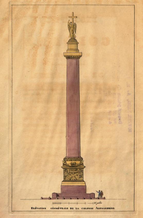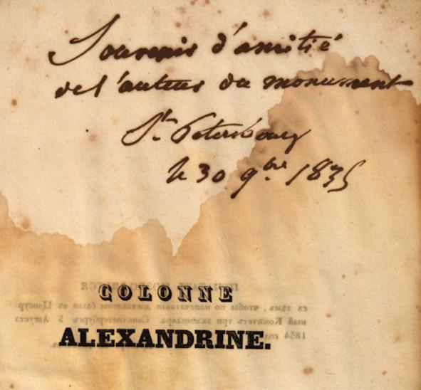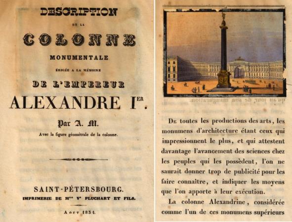 Знакомство с Александровской колонной, наверное, следует начать с азов — с чтения первых статей Монферрана, написанных для публики в процессе создания им памятника Александру I. Эти статьи в разное время были опубликованы в прессе. В 1834 году архитектор собрал их в небольшую книжицу и издал сразу после открытия монумента. Экземпляр найденной и переведённой книги хранится в библиотеке Мичиганского университета.