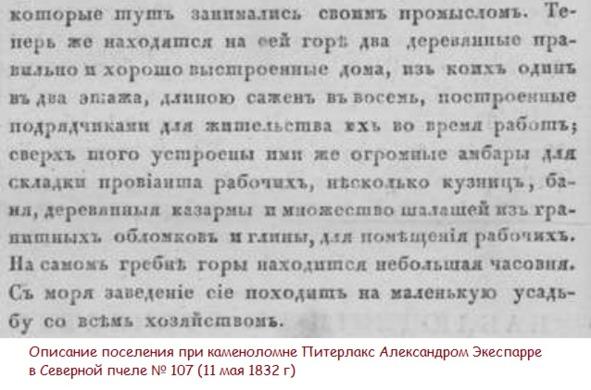 В одной из бухт на северо-востоке Финского залива, между Выборгом и Фридрихсгамом, находится каменоломня Питерлакс (*), к которой ведёт неровная тропа, проложенная между скалами. Расположенная на полпути вверх по побережью и примерно в 300 футах от пляжа, эта каменоломня имеет живописный и дикий вид. Единственными следами человеческих рук, которые можно увидеть, являются скопившиеся обломки недавно отколовшихся гранитных масс и несколько жалких хижин, вокруг которых сгруппированы земляные хижины рабочих. Гора находится на высоте 49 футов над уровнем моря и наклонена на 5 градусов к горизонту в сторону точки на берегу, где построен передовой пирс для облегчения погрузки монолита. Вершина этой примитивной скалы местами голая, а местами покрыта тонким слоем почвы и кустарников. Масса, которую нужно было извлечь для изготовления ствола колонны, составляла 98 футов в длину и среднюю толщину — 22 фута; её вес можно оценить примерно в девять миллионов пятьсот семьдесят шесть тысяч фунтов (4 343, 600 тонн). Она была высечена из цельной скалы с трёх сторон (**). Эта замечательная работа, требующая мужества и терпения, в которой постоянно было задействовано 600 рабочих, продолжалась два года. Эта плотная порода без какой-либо помощи глютена (клейковины) обладает в своих составных частях такой адгезией, что их легче разломить, чем расщепить.