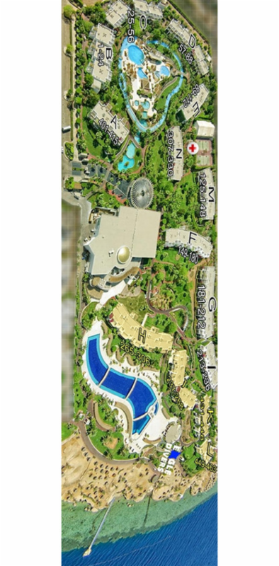 Слева находится отель «Otium Hotel Amphoras» 5*, справа — «Sunrise Select Diamond Beach Resort» 5*.