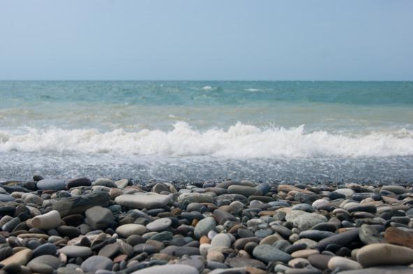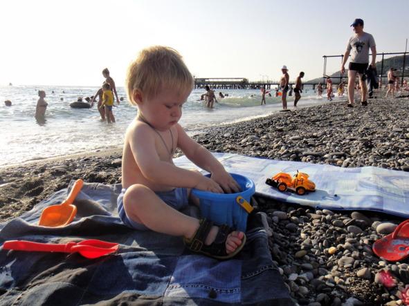 Если смотреть на море, то слева от говнетечки, ой, простите, от реки Лоо — стройка, справа — типа пляж, даже есть кафешка, музыка, тент, дают в аренду лежаки. Пляж маленький. Мы попробовали отойти вправо как можно дальше от говнетечки — но там такие камни, что в воду не зайти даже без младенца, с младенцем можно даже не пытаться. Пришлось отбросить лишние принципы и брезгливость, и дать левее, к мутным зловонным водам горной реки, собравшей на своём пути к морю всю грязь с посёлка. Там хотя бы на видимой части пляжа булыжники убраны, но в воде камни, блин, как в Шарме, только в Шарме вода прозрачная, между камнями плавают скаты и красивые рыбки, а в воду можно войти с удобных, сделанных специально для людей, понтонов, а тут предлагается просто самоубиться об эти камни, потому то «других тут пляжей нет, тут все такие» (с). Это спасатель мне сказал, когда я спросила, где тут можно нормально искупаться.