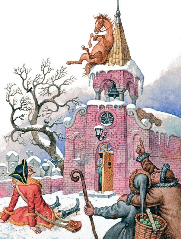 Вдруг где-то высоко в воздухе раздалось ржание. Я взглянул вверх: мой конь, привязанный за повод, висел на верхушке колокольни. Я сразу понял, в чём дело: накануне снег засыпал деревню и окрестности так густо, что образовалось обширное поле, по которому я вчера ехал. Ночью внезапно наступила оттепель, и снег стаял. Пока спал, я незаметно опускался всё ниже и ниже, пока не достиг твёрдой земли. Таким образом и очутился на кладбище, – а то, что принял вчера за кол и к чему привязал лошадь, оказалось шпилем колокольни.