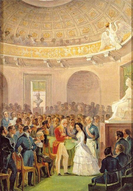 Софья Сухово-Кобылина «Софья Васильевна Сухово-Кобылина, получающая на акте в Академии художеств первую золотую медаль за Пейзаж с натуры». 1854